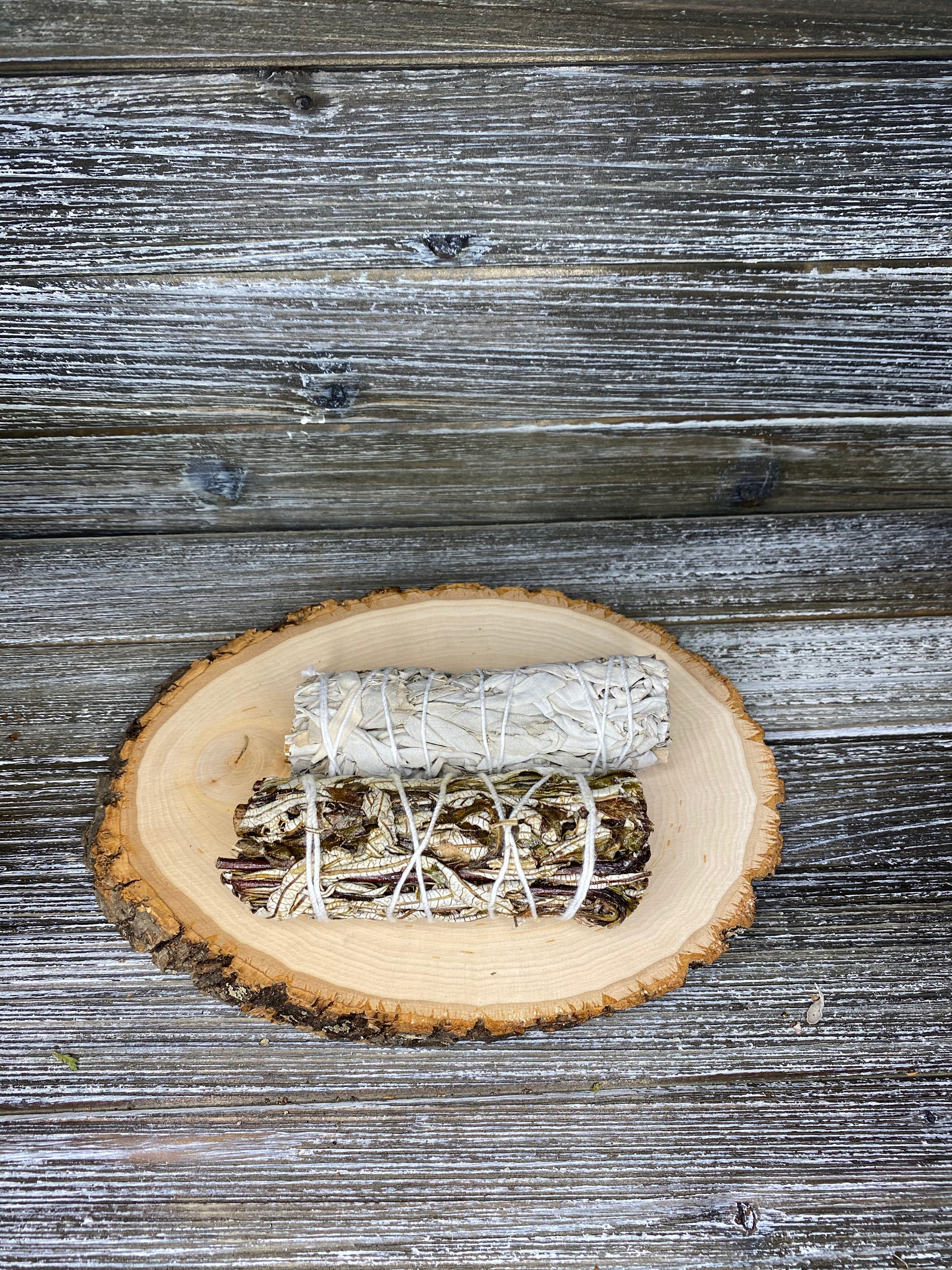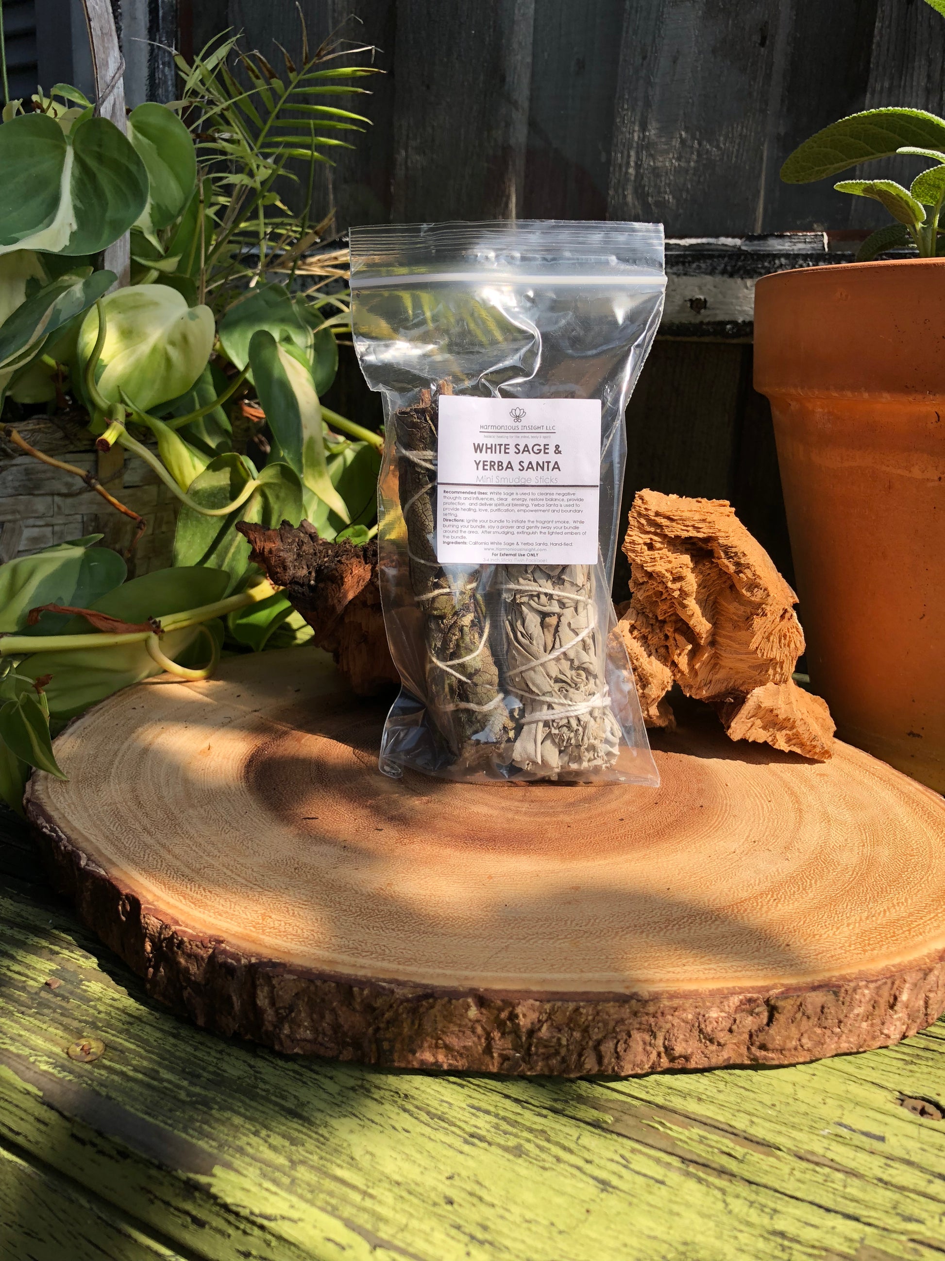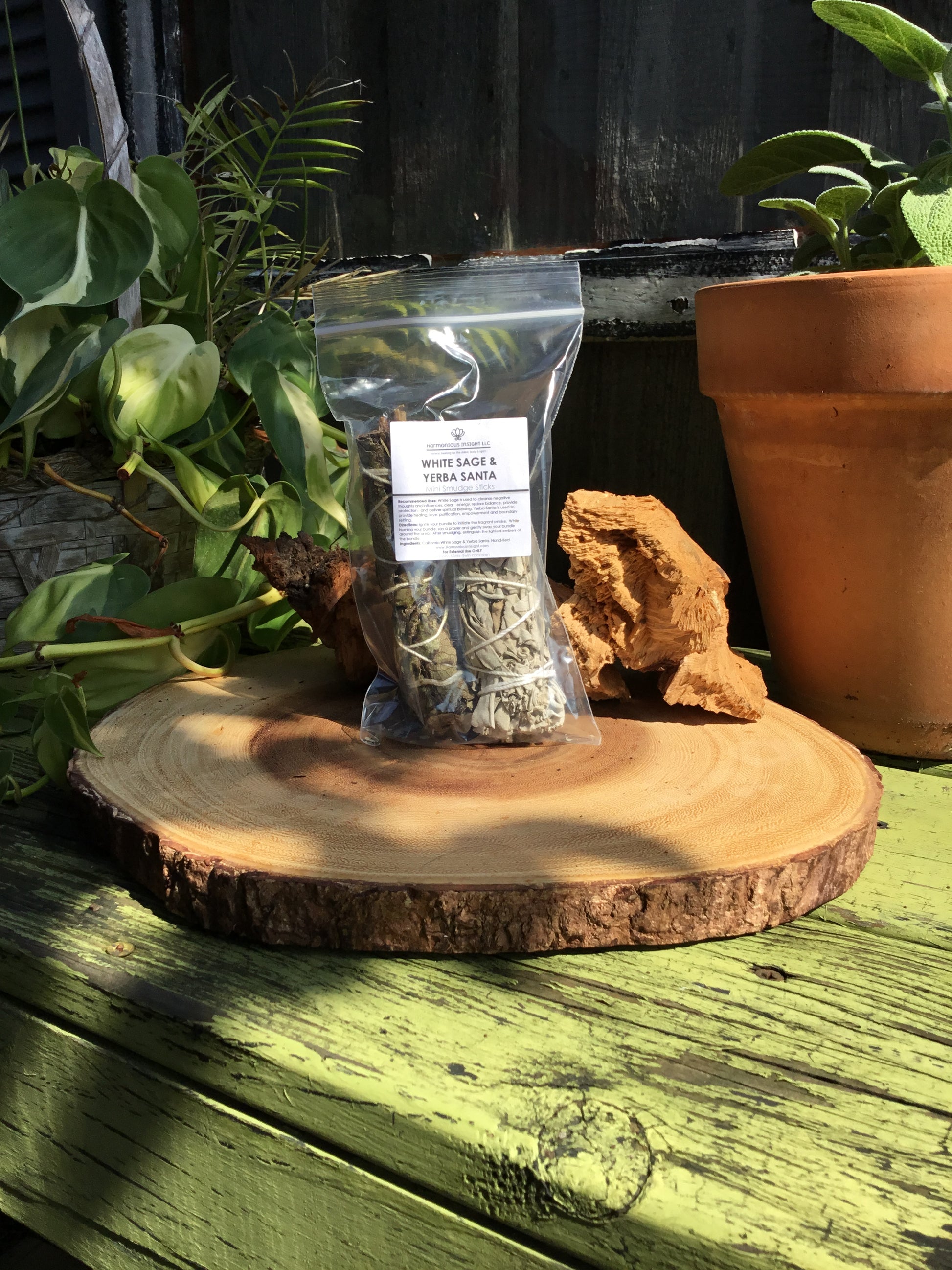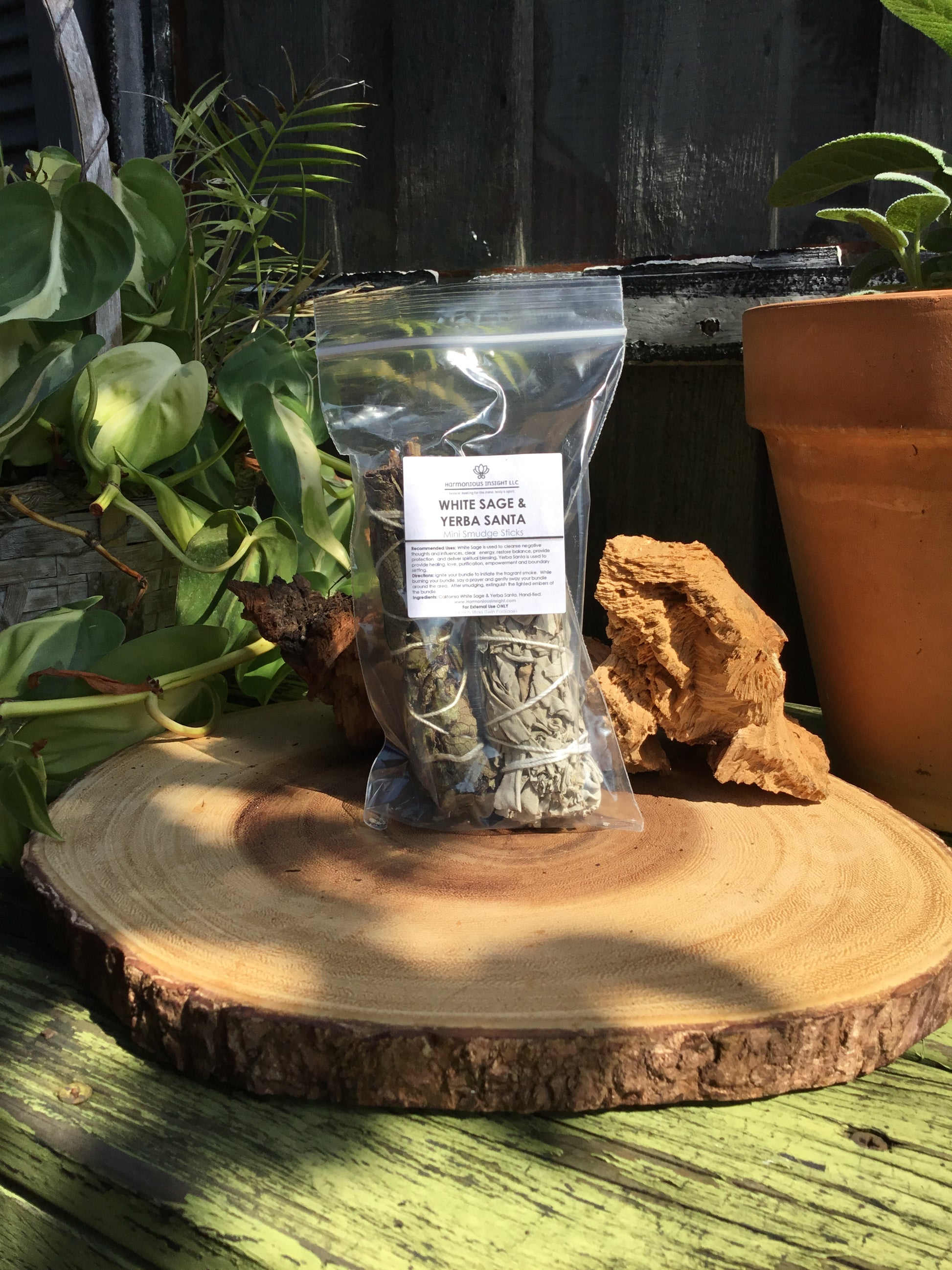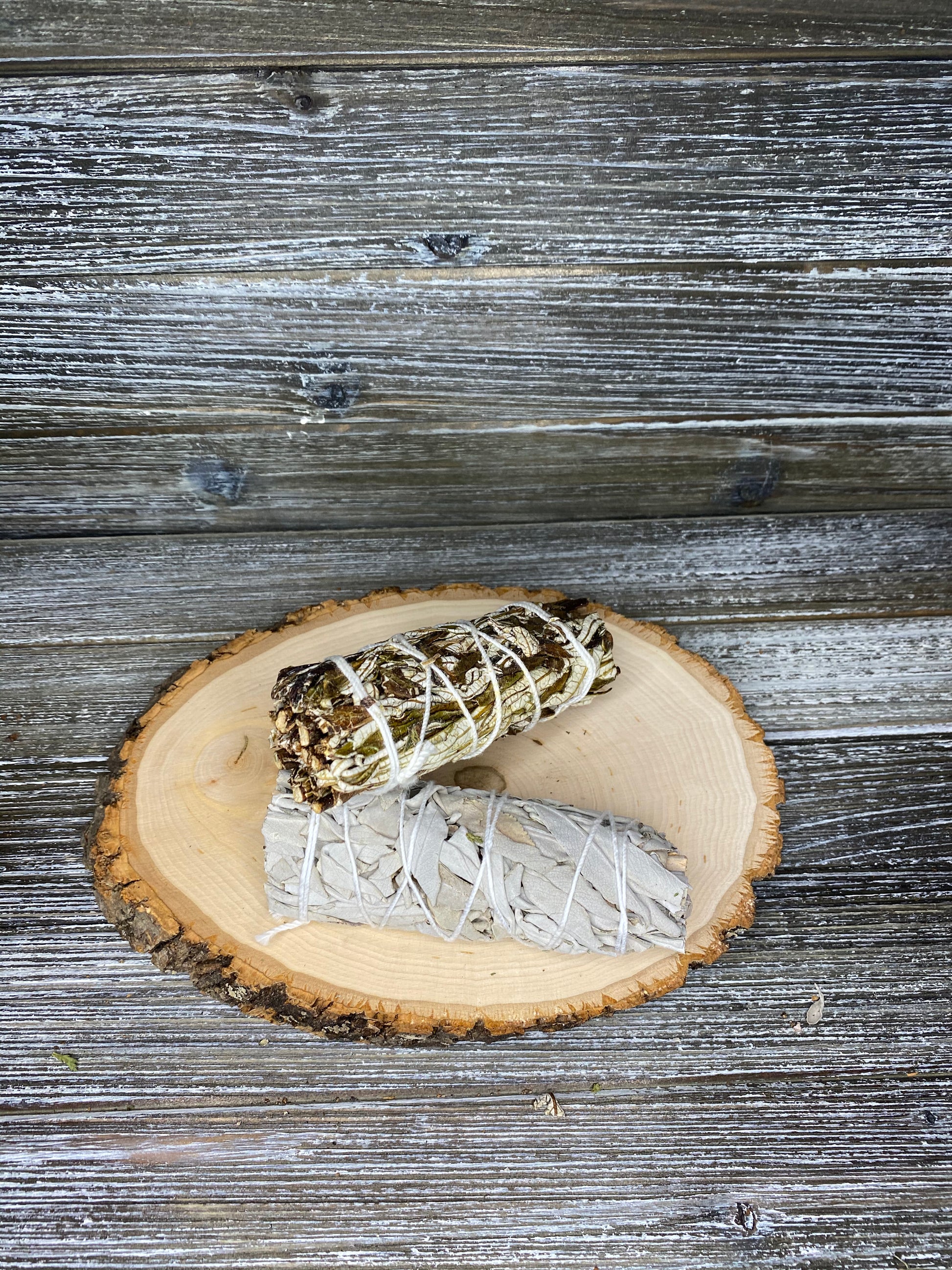 The California White Sage and Yerba Santa twin pack includes a bundle of California White Sage and Yerba Santa. Each bundle is hand-tied and measures 3”- 5” in length.