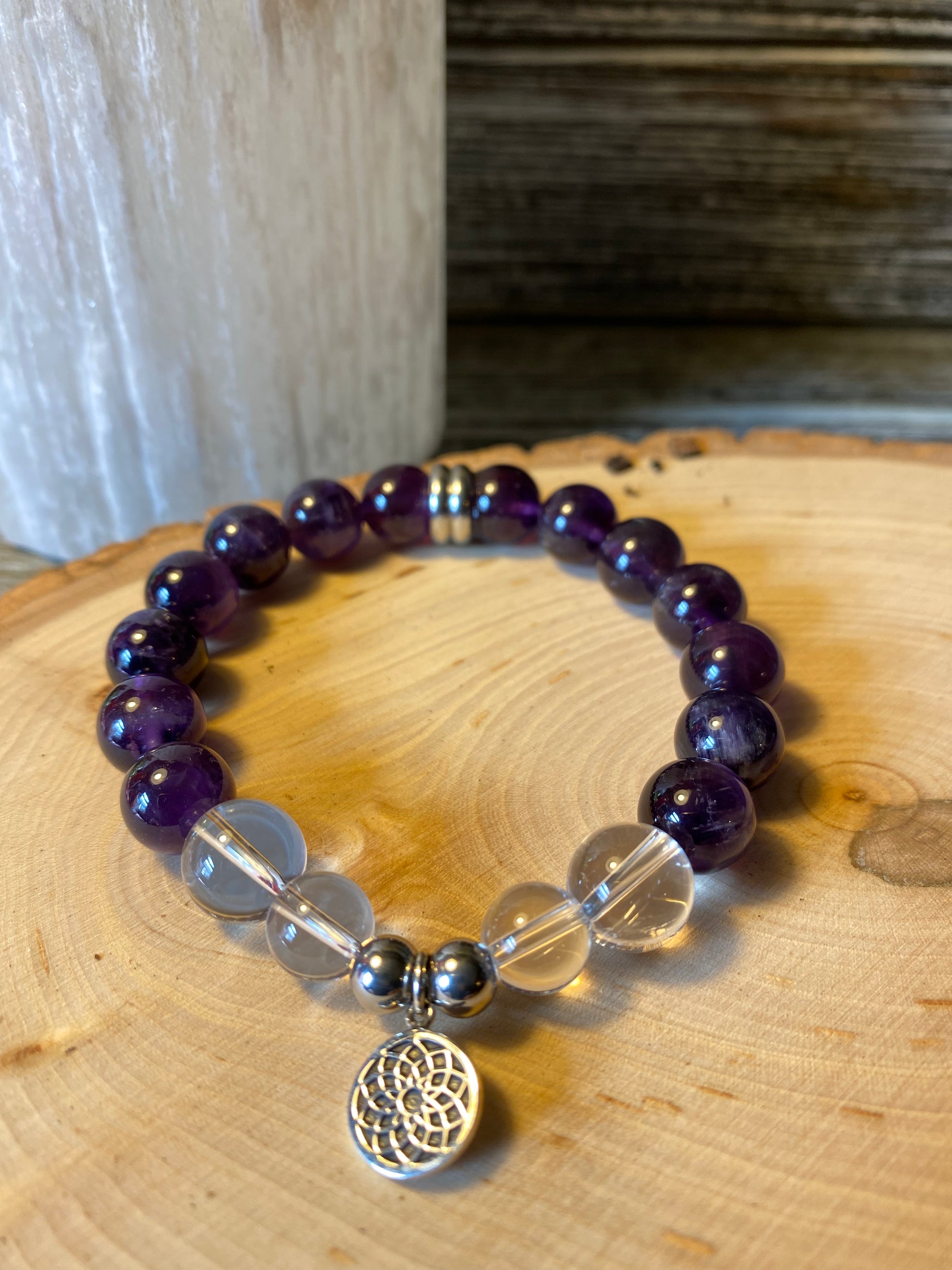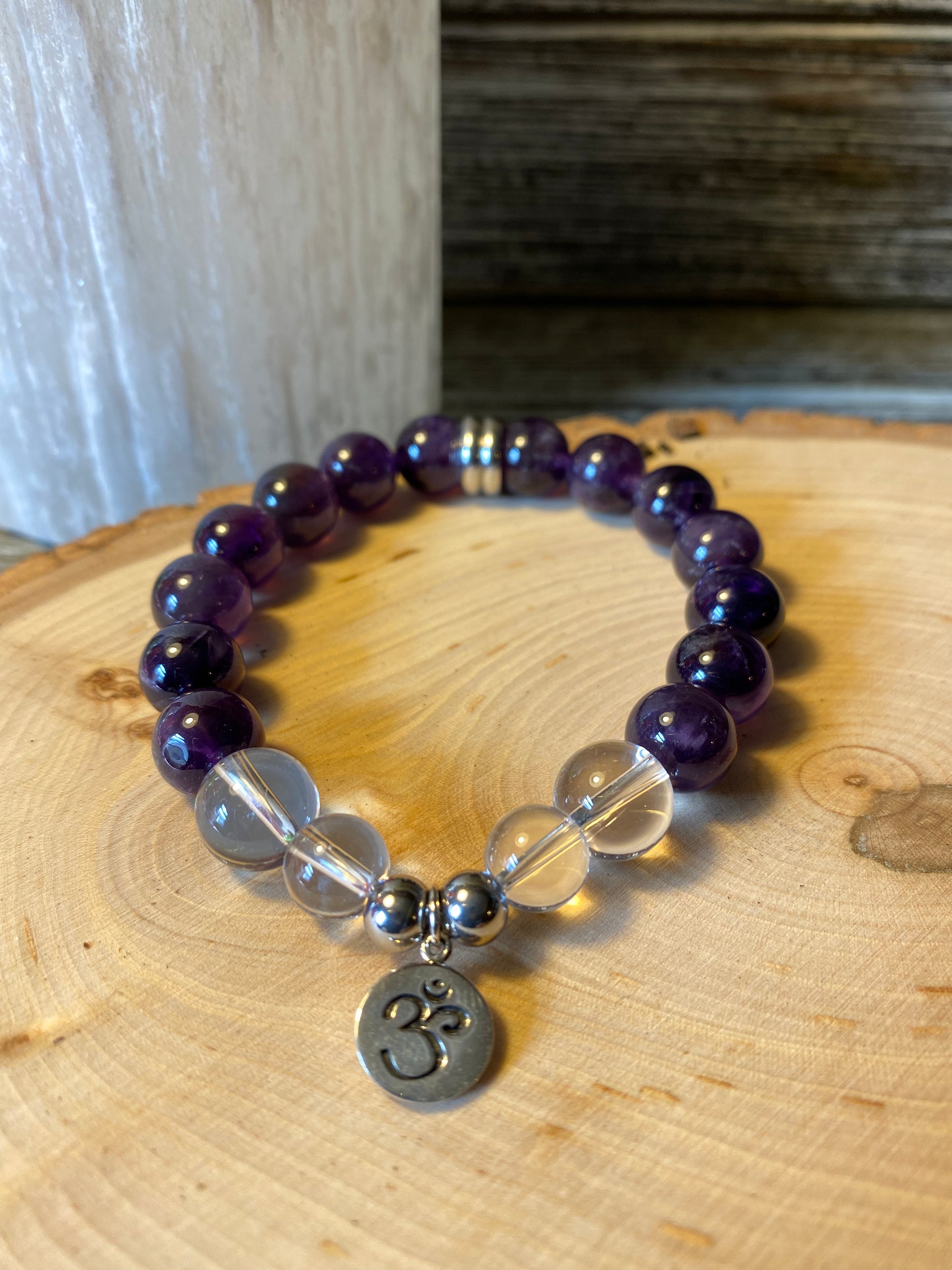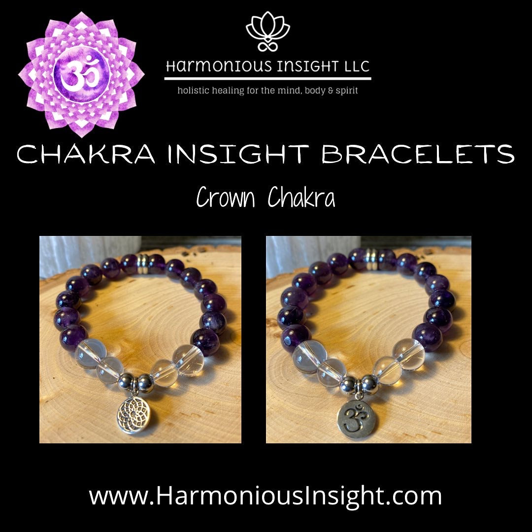 Harmonious Insight Chakra Bracelets are designed to highlight each of the seven main chakras individually. The CROWN CHAKRA bracelet has amethyst and clear quartz stones/crystals along with a sterling silver CROWN chakra charm, and stainless-steel accents.