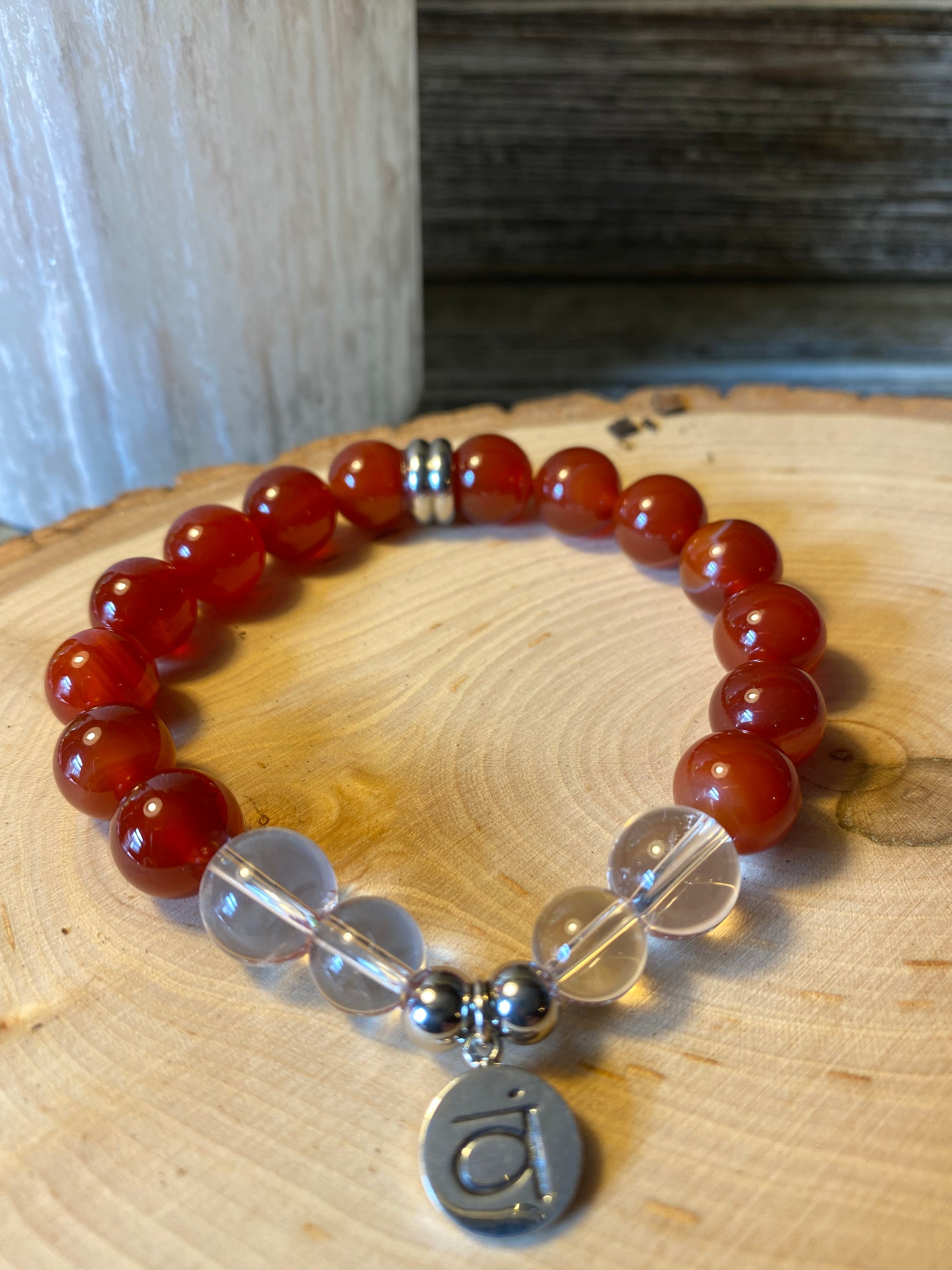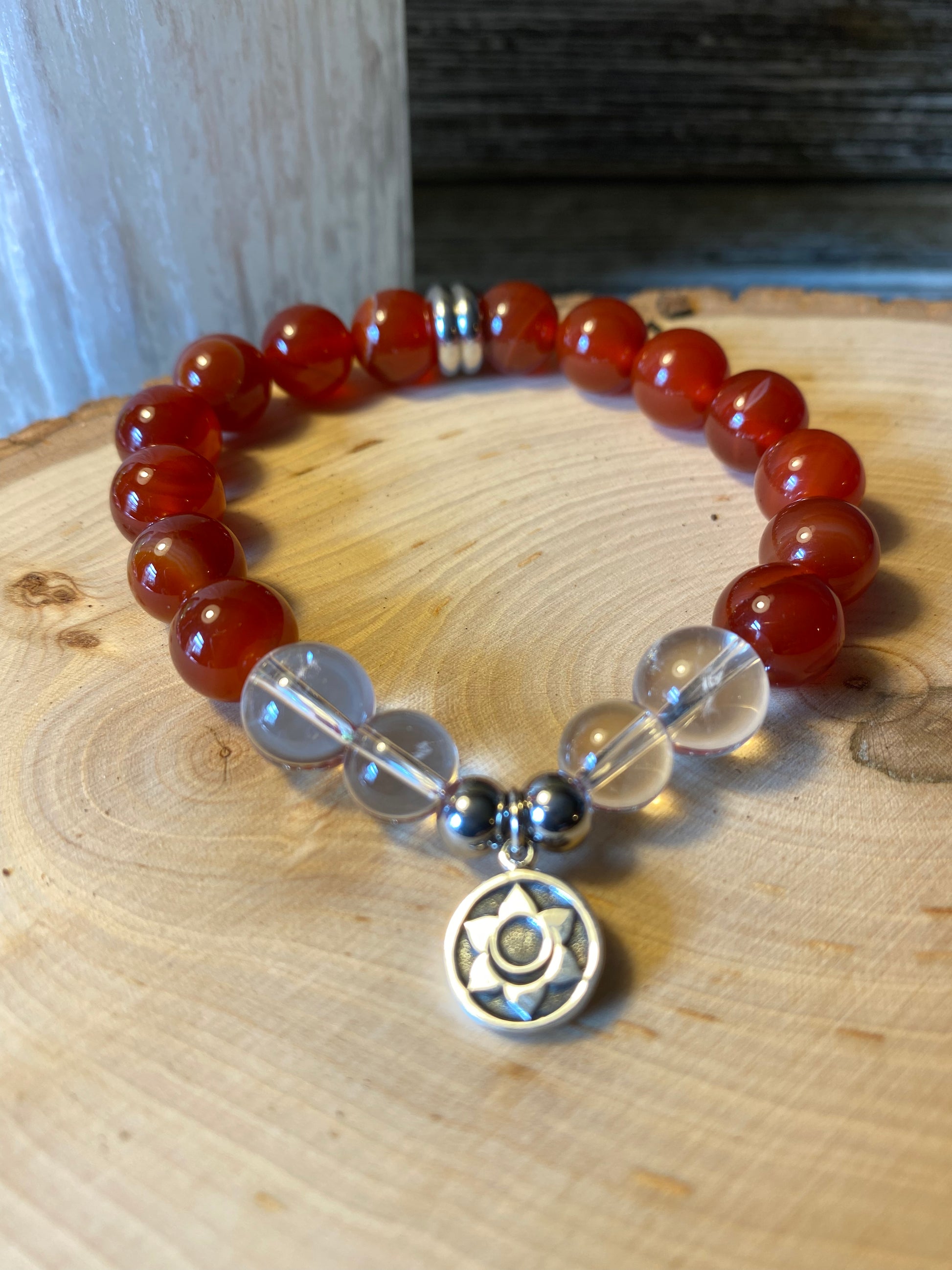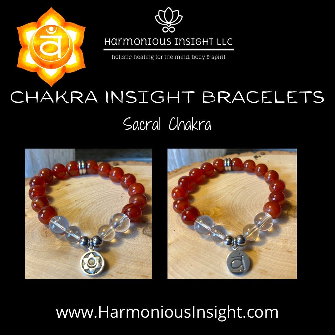 Harmonious Insight Chakra Bracelets are designed to highlight each of the seven main chakras individually. The SACRAL CHAKRA bracelet has carnelian and clear quartz stones/crystals along with a sterling silver SACRAL chakra charm, and stainless-steel accents.