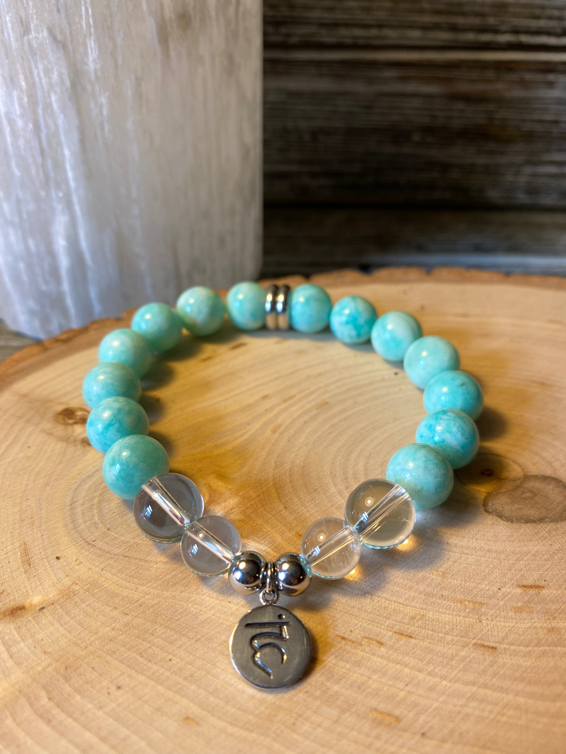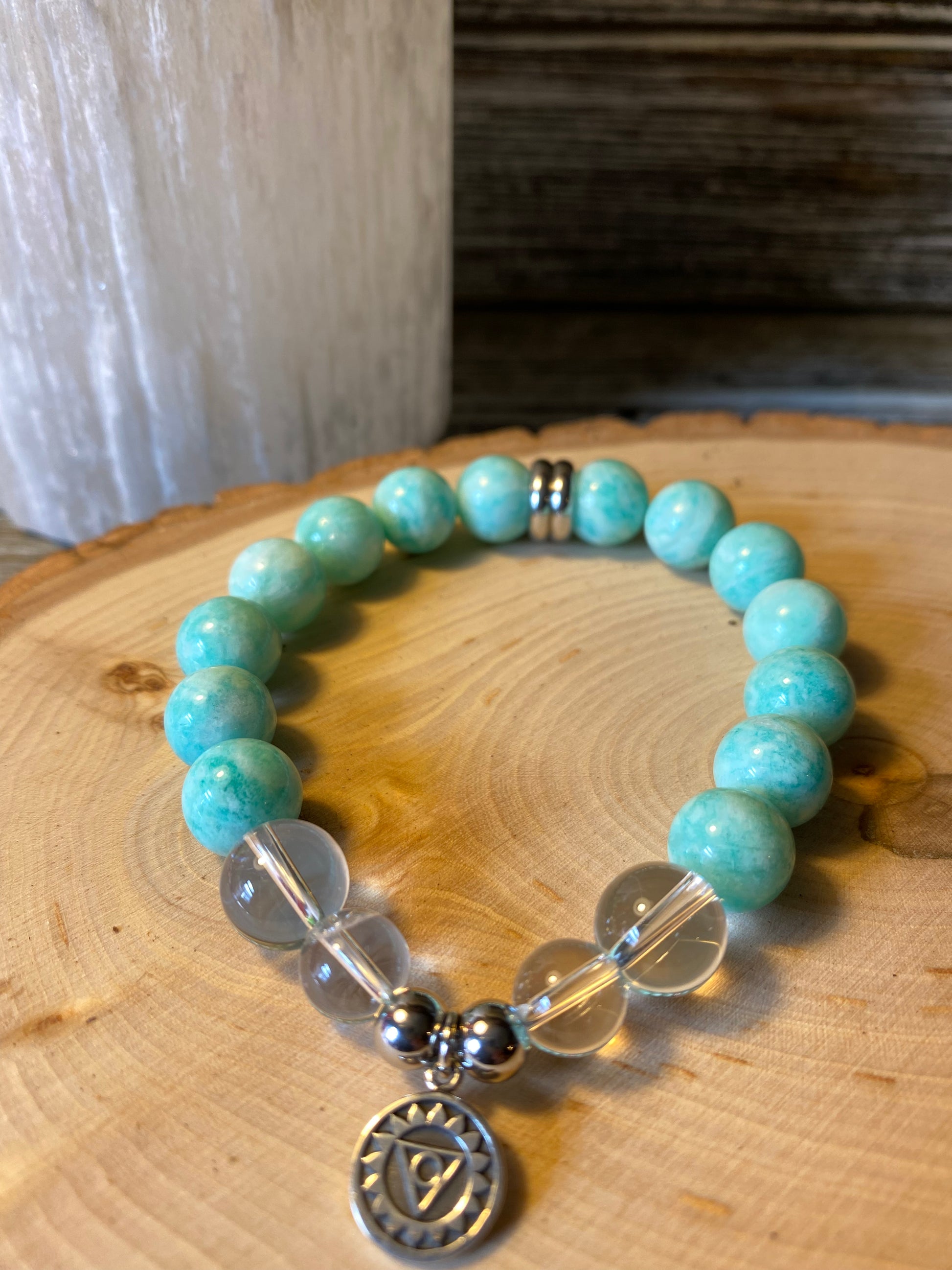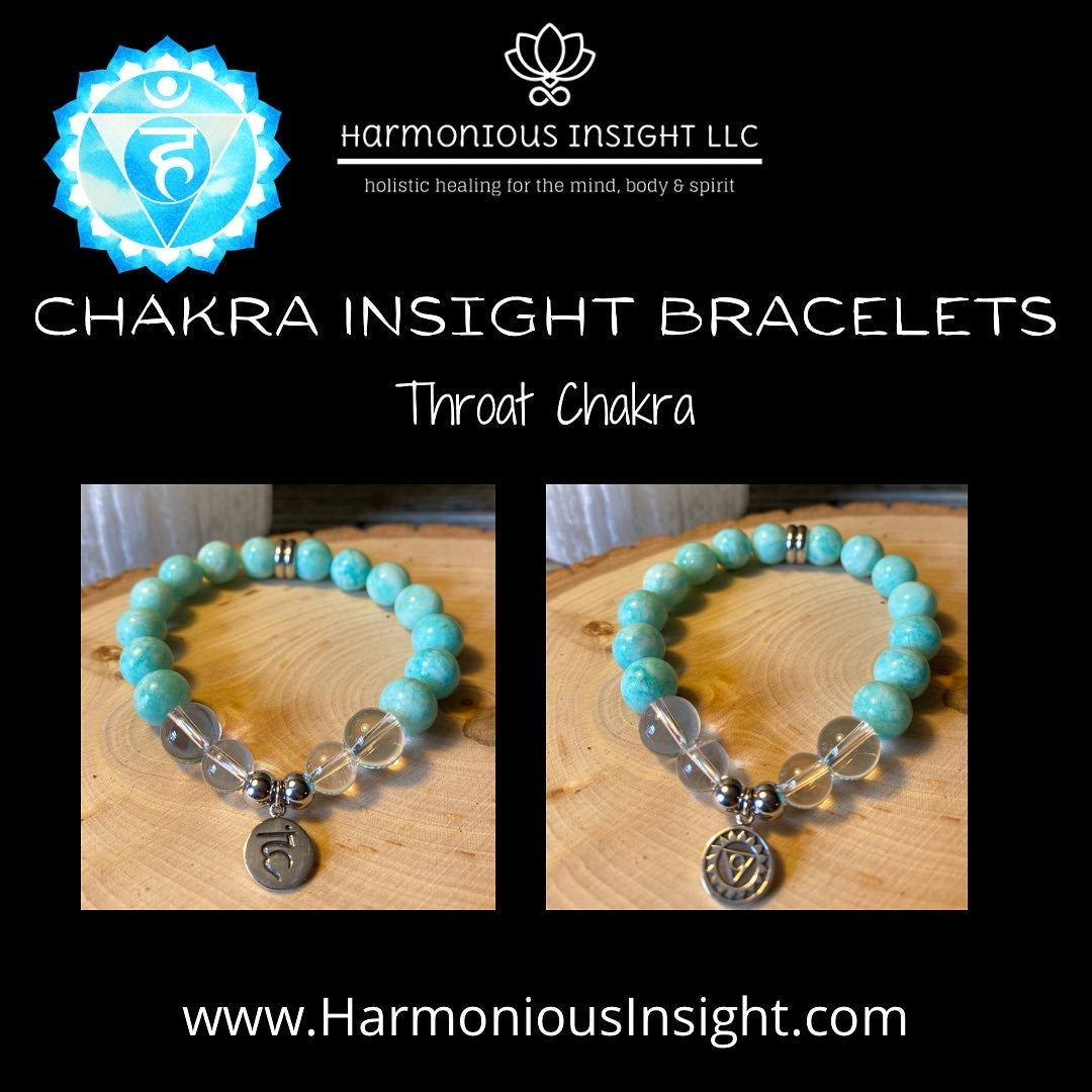 Harmonious Insight Chakra Bracelets are designed to highlight each of the seven main chakras individually. The THROAT CHAKRA bracelet has amazonite and clear quartz stones/crystals along with a sterling silver THROAT chakra charm, and stainless-steel accents.