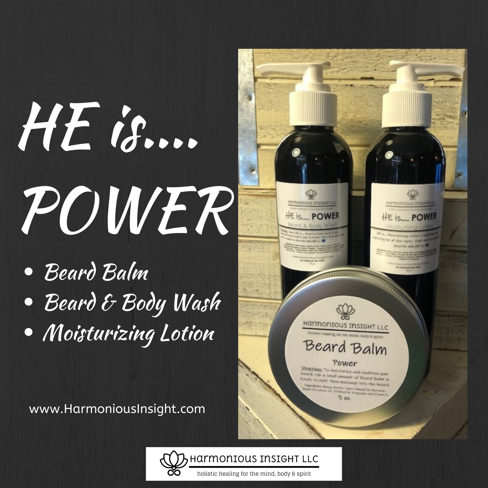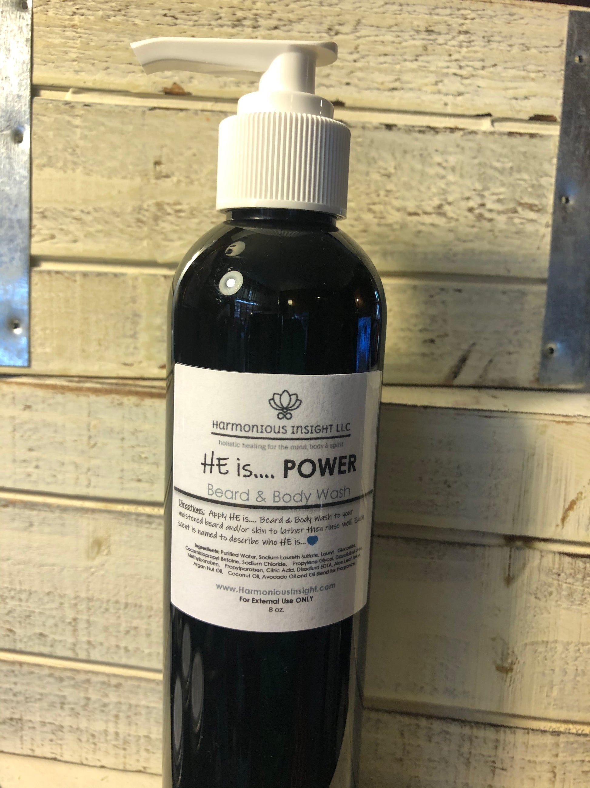 HE is… POWER Beard & Body Wash scent is a blend of citrus, musk and sandalwood.