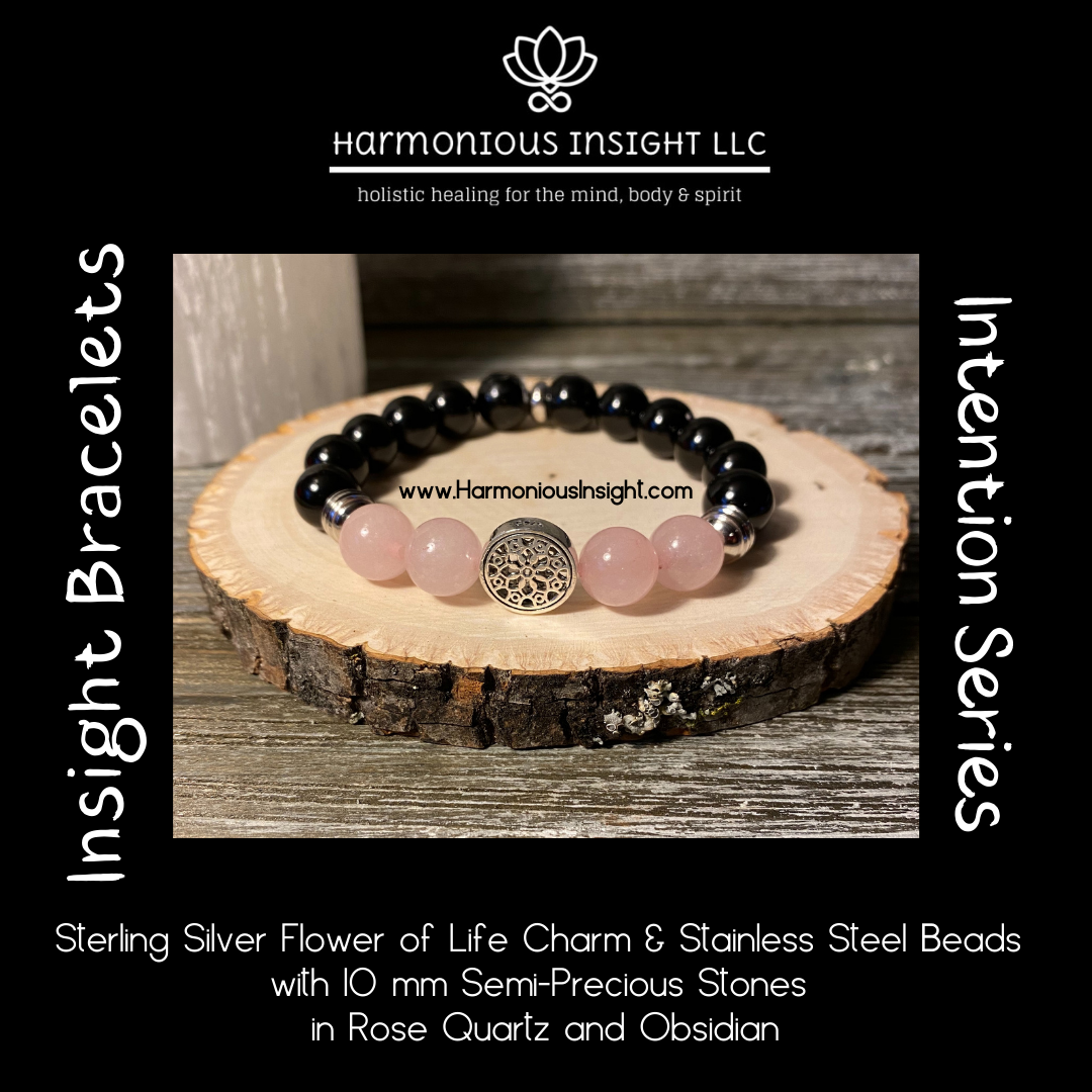 Insight Bracelet - Sterling Silver Flower of Life Charm with Rose Quartz and Obsidian