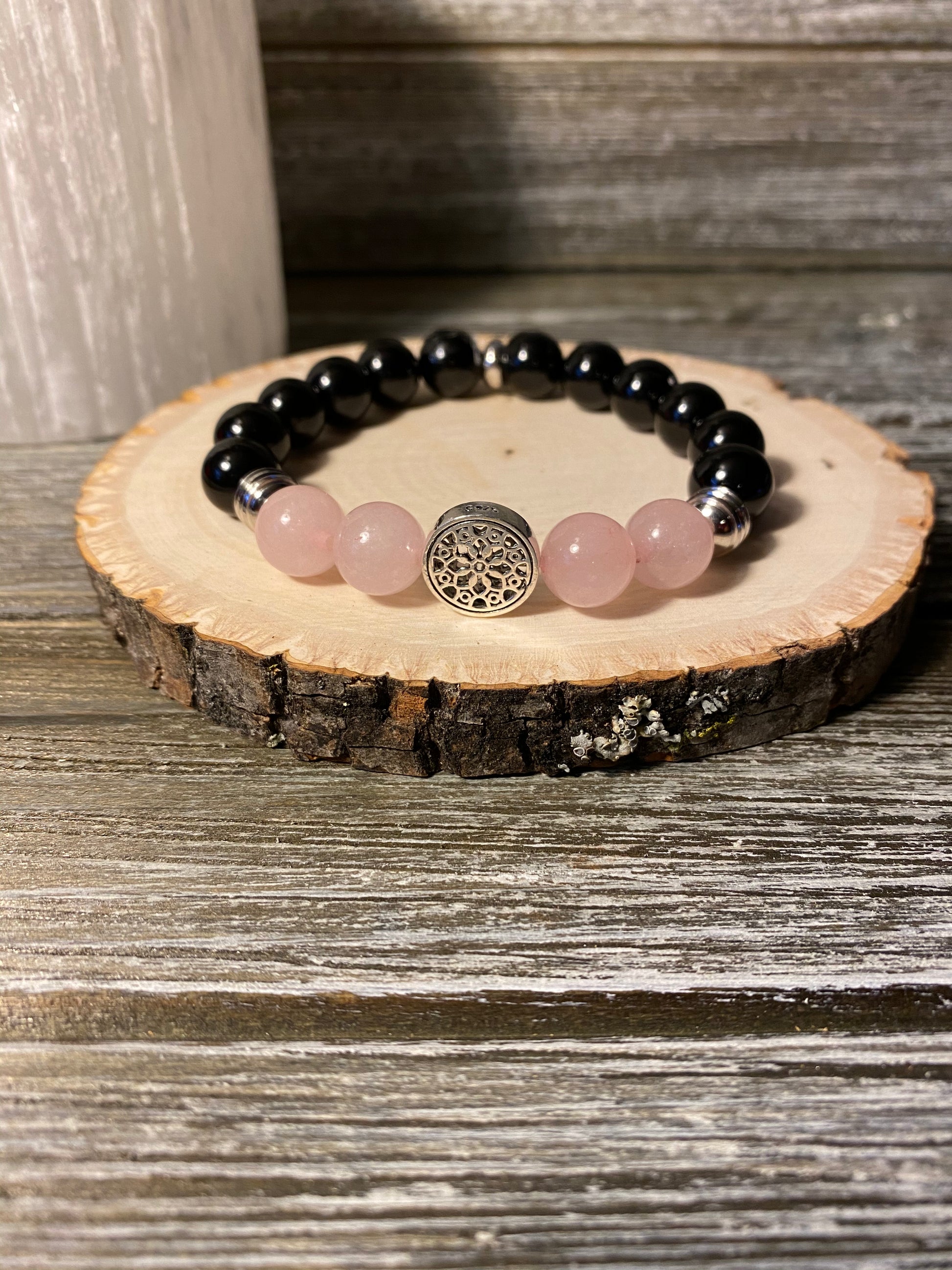 Sterling Silver Flower of Life Charm & Stainless Steel Beads with 10 mm Semi-Precious Stones in Rose Quartz and Obsidian.