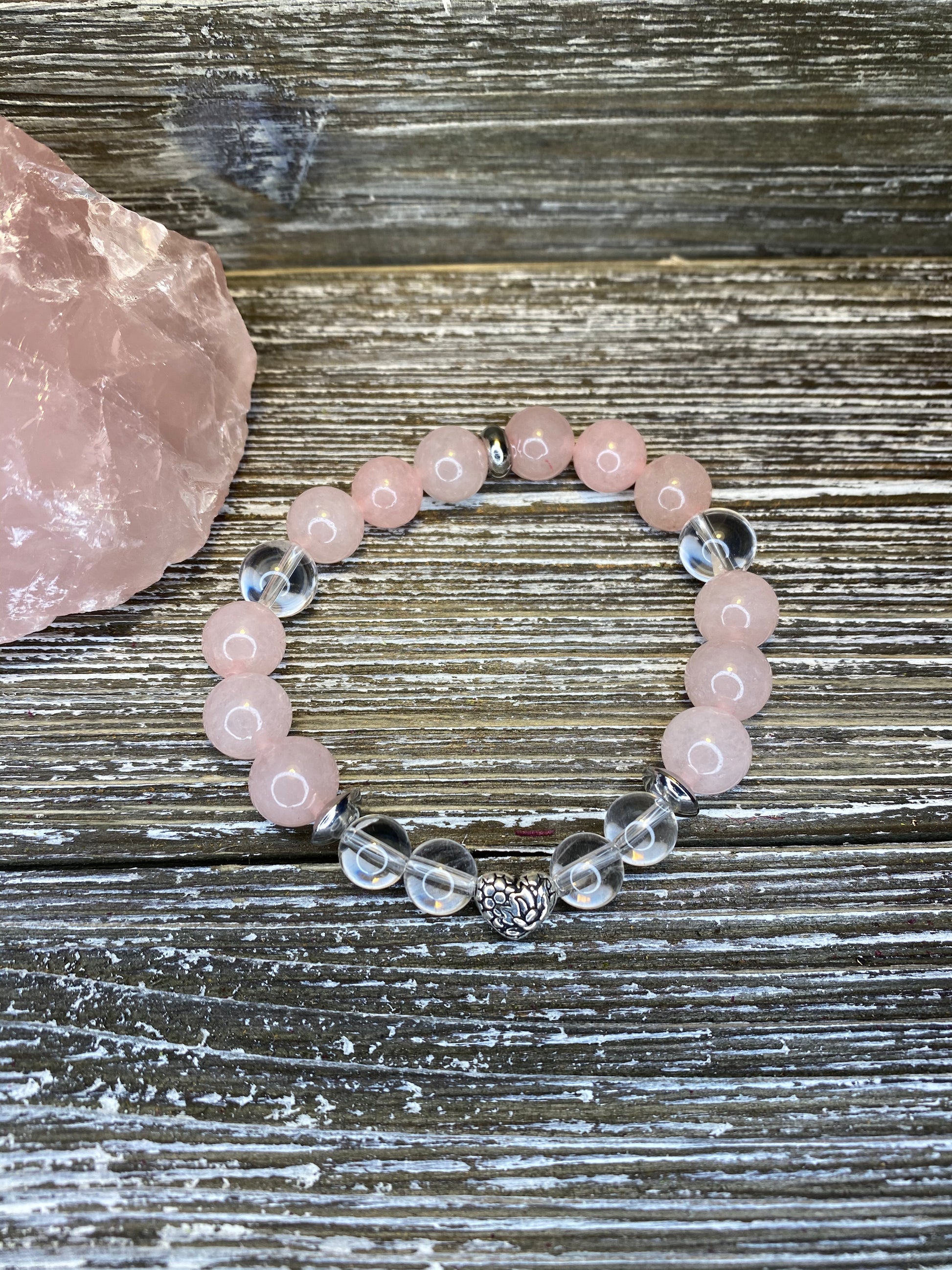 Sterling Silver Heart Charm & Stainless Steel Accent Disk Beads with 8 mm Semi-Precious Stones in Rose Quartz and Clear Quartz.