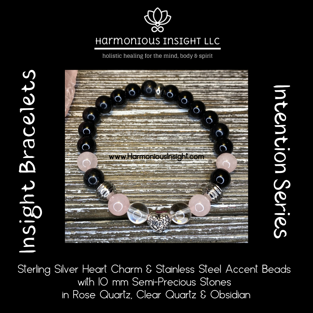 Insight Bracelet - Sterling Silver Heart Charm with Rose Quartz, Clear Quartz, and Obsidian