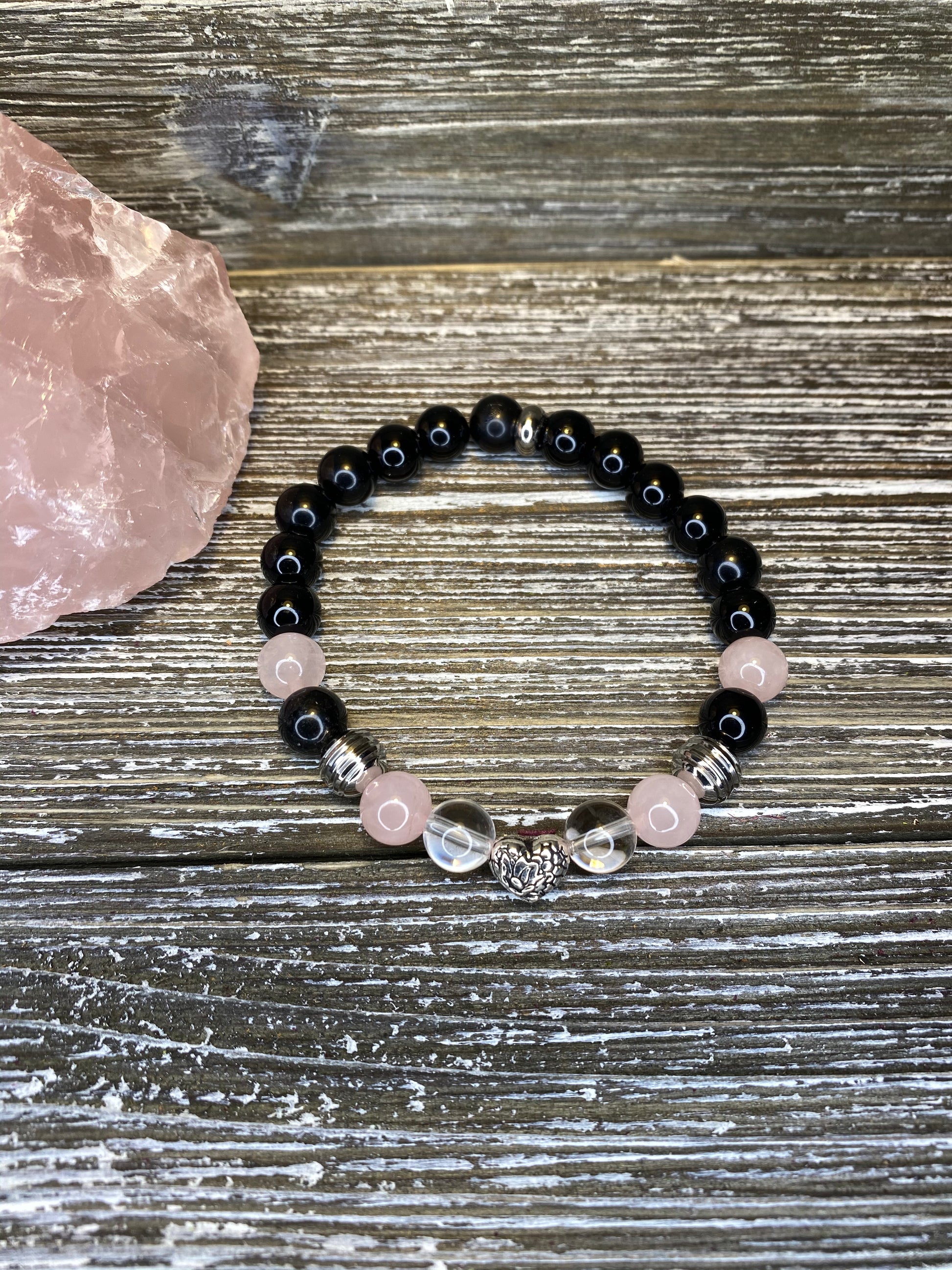 Sterling Silver Heart Charm & Stainless Steel Accent Beads with 8 mm Semi-Precious Stones in Rose Quartz, Clear Quartz & Obsidian.