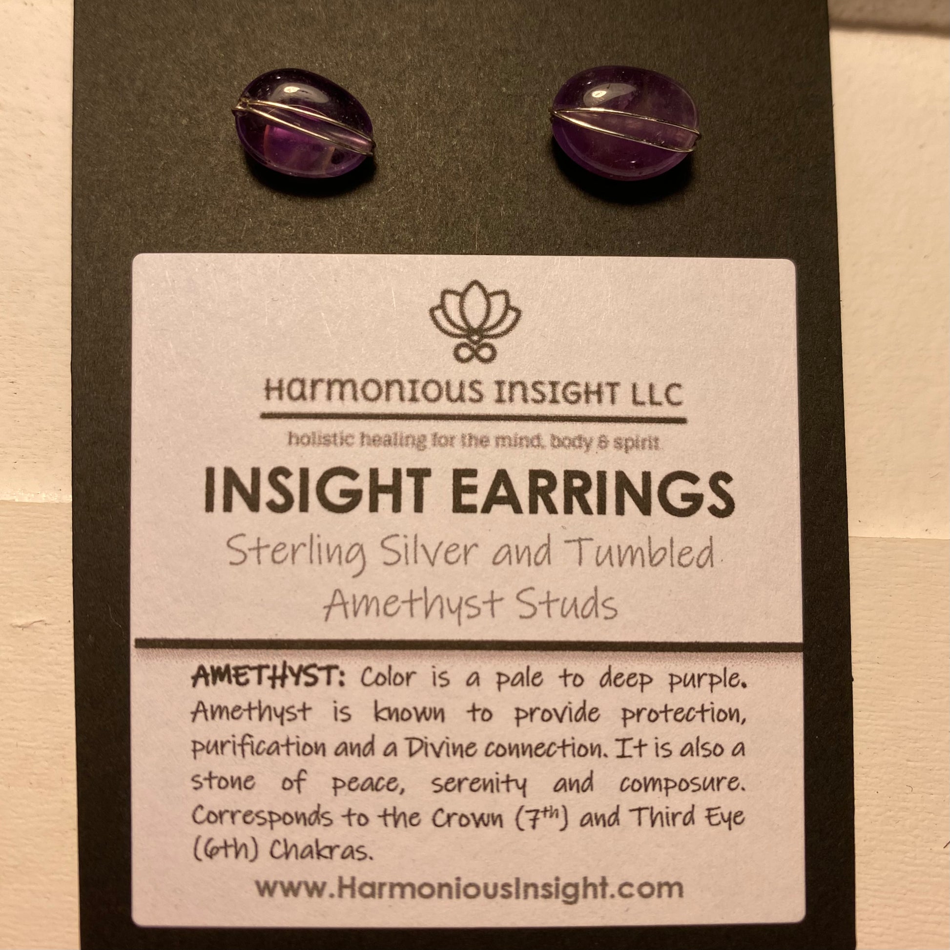 INSIGHT Earrings are semi-precious tumbled stone/crystal stud earrings wrapped in sterling silver. The semi-precious stones/crystals are meant to support the wearers insightful intentions.