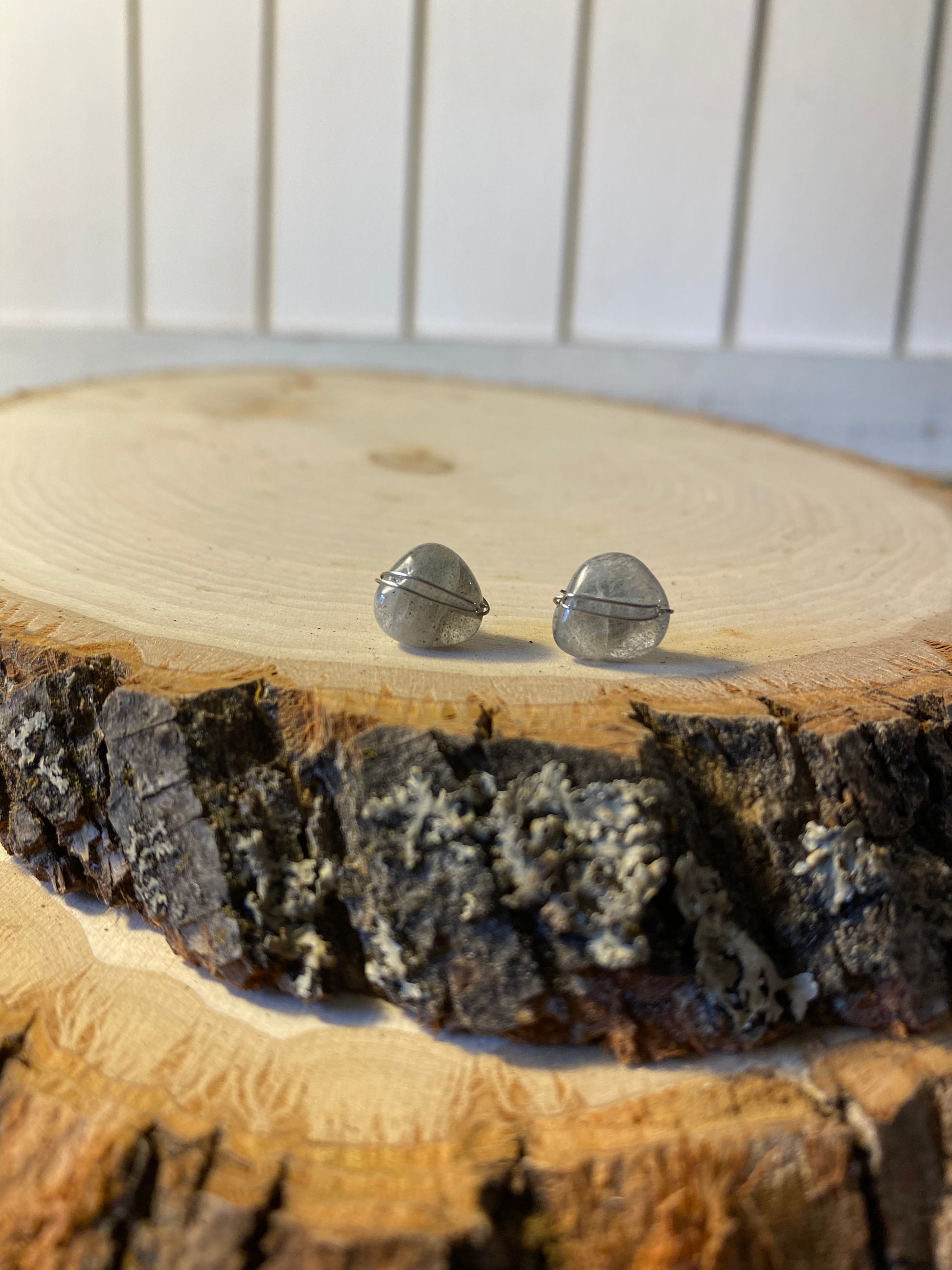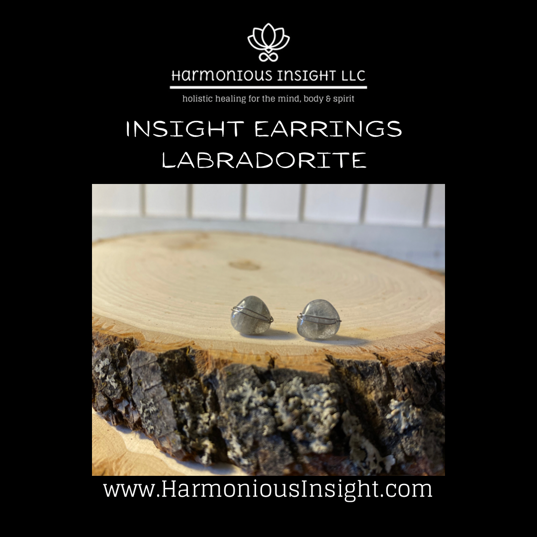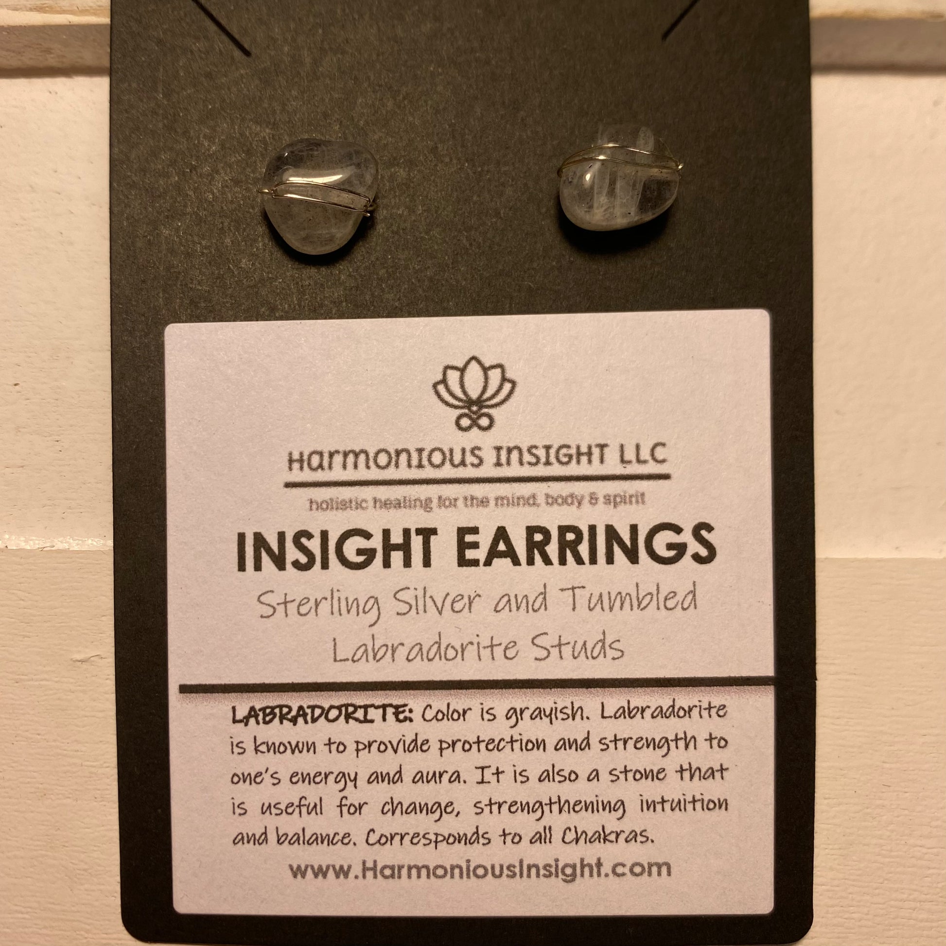 INSIGHT Earrings are semi-precious tumbled stone/crystal stud earrings wrapped in sterling silver. The semi-precious stones/crystals are meant to support the wearers insightful intentions.