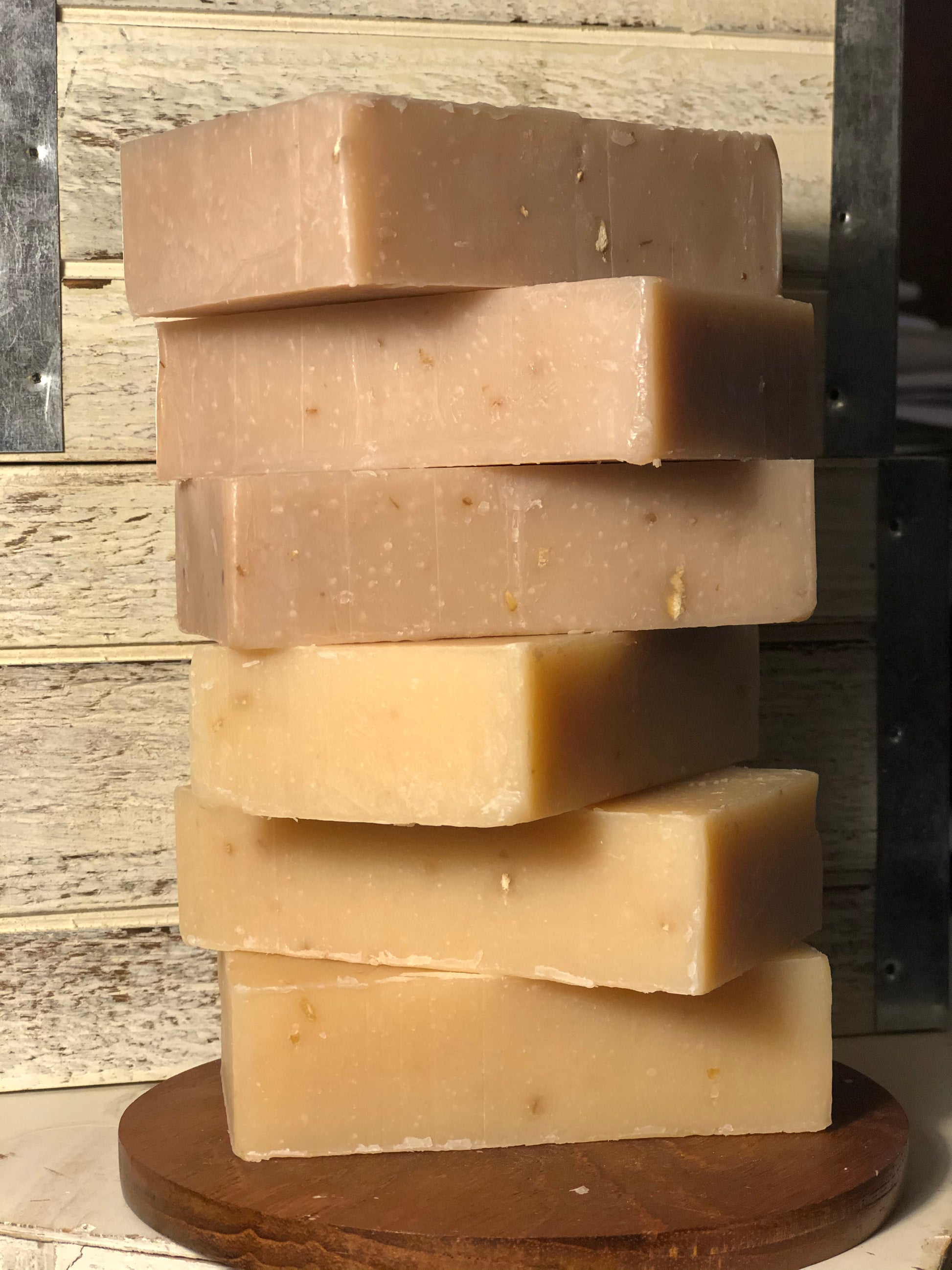 Ingredients: Olive Oil, Soybean Oil, Coconut Oil, Corn Oil, Sunflower Oil, Organic Shea Butter, Water, Sodium Hydroxide (Lye), Ground Oatmeal. and Fragrance Oil.