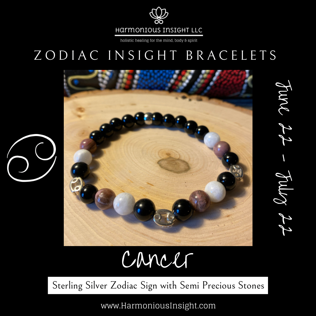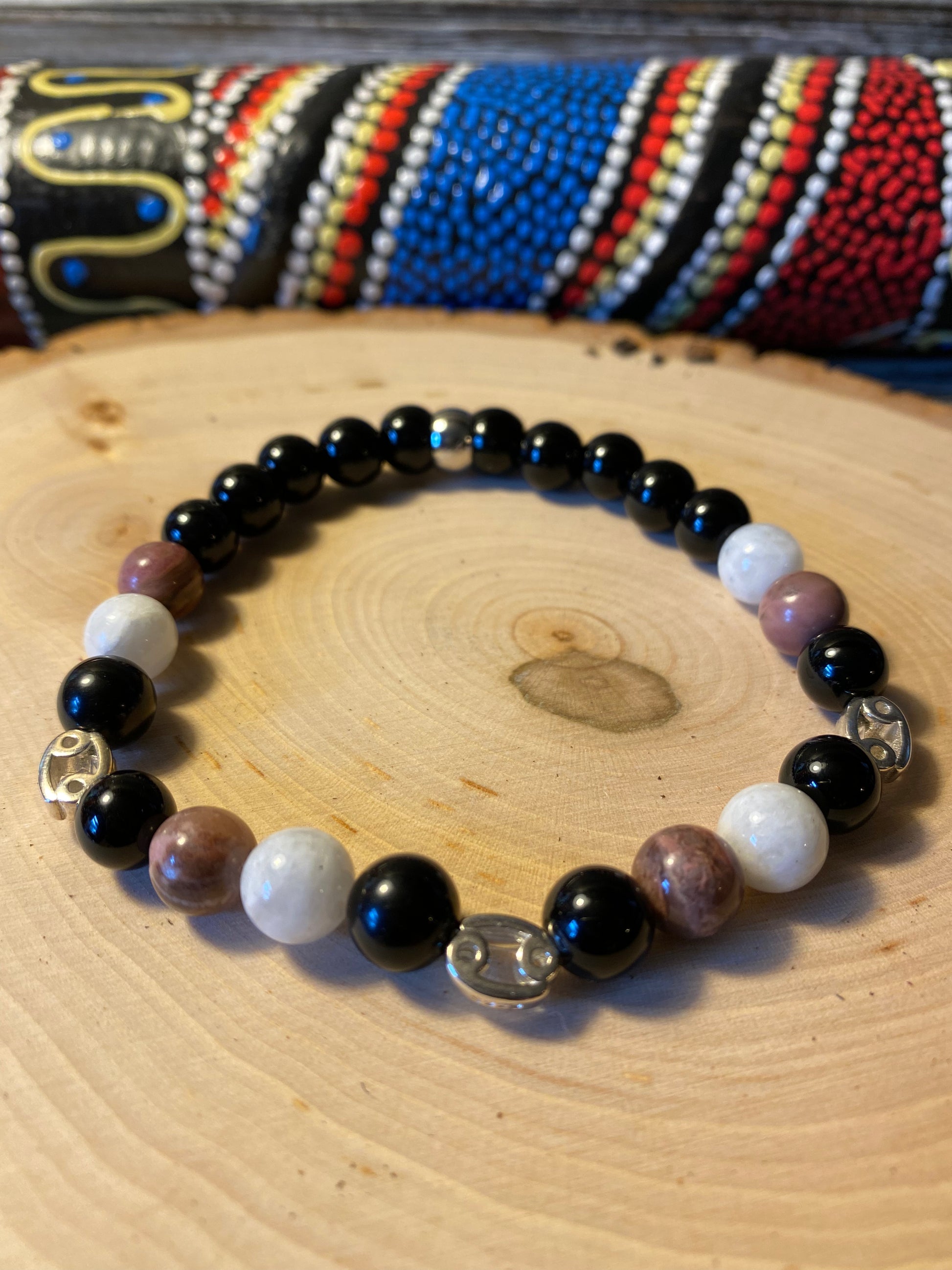 Cancer (Crab) is the zodiacal constellation that represents the dates of June 22nd - July 22nd. These dates correlate with the Sun’s passage through this constellation. The astrological element for the Zodiac Sign of Cancer is water. This Zodiac Insight Bracelet contains three Sterling Silver Cancer Charms with 8 mm Semi-Precious Stones in Rhodonite, Moonstone, and Black Jasper. The bracelet circumference is approximately 8.5 inches. Please contact Harmonious Insight directly if you need an adjustment in size.