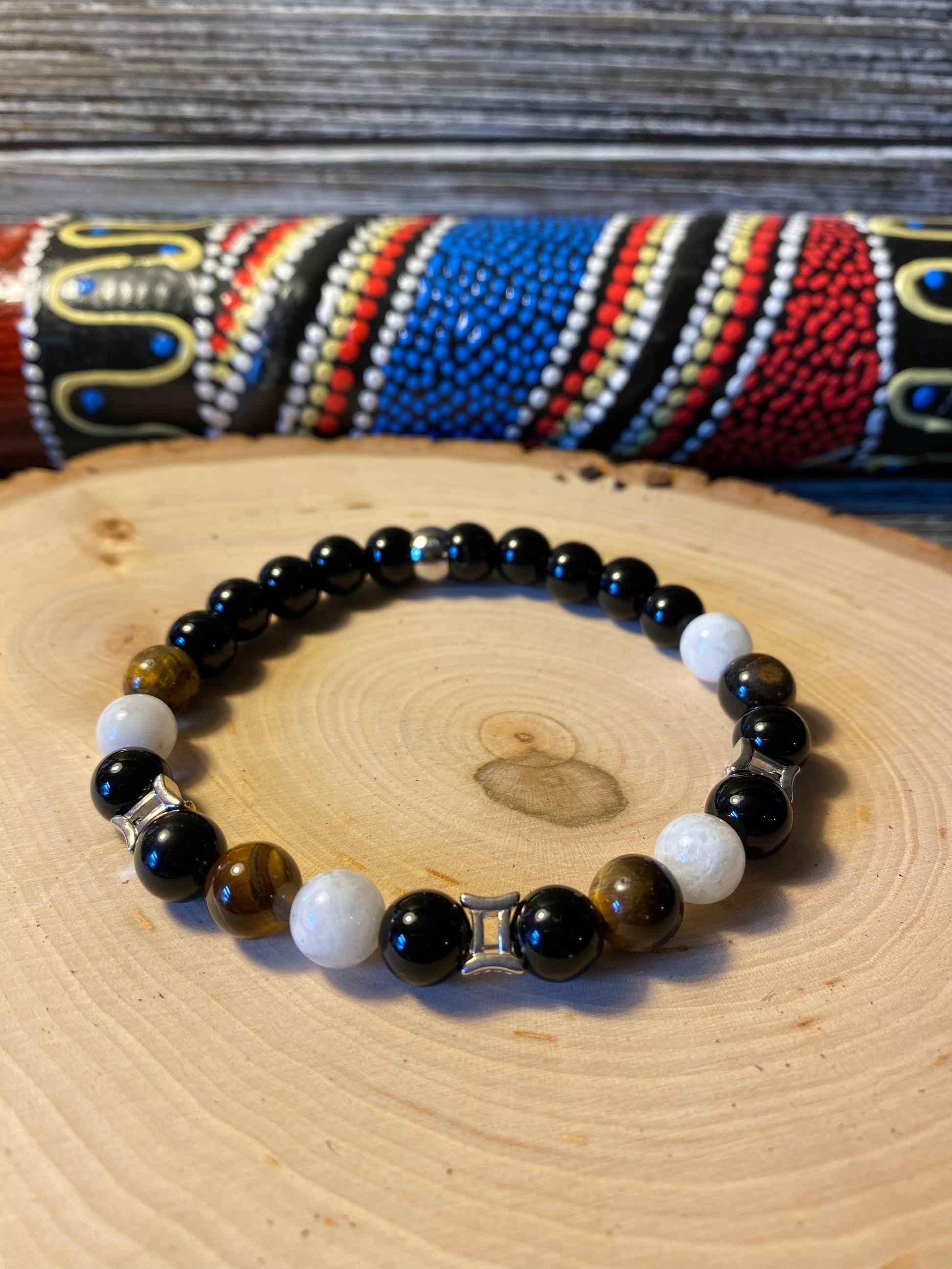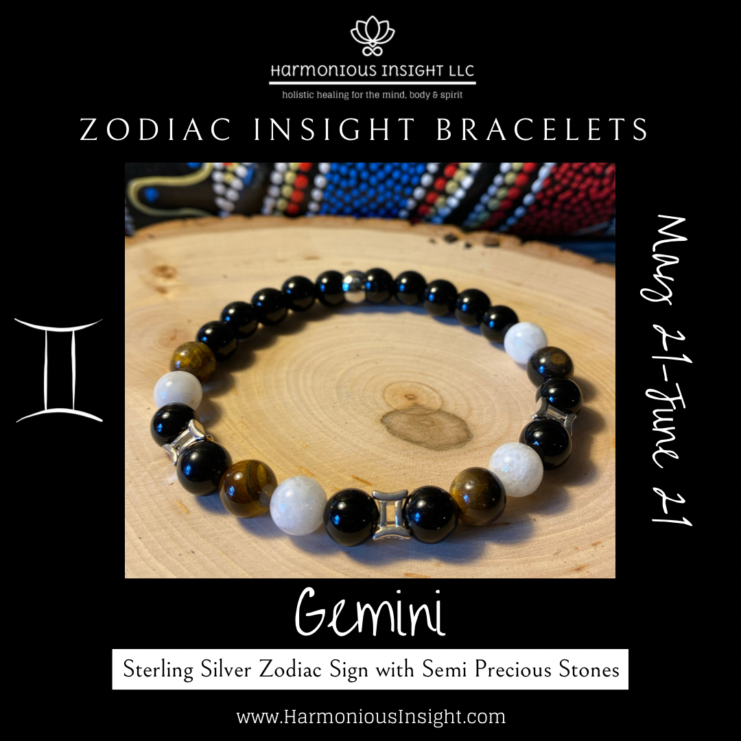 Gemini (Twins) is the zodiacal constellation that represents the dates of May 21st - June 21st. These dates correlate with the Sun’s passage through this constellation. The astrological element for the Zodiac Sign of Gemini is air. This Zodiac Insight Bracelet contains three Sterling Silver Gemini Charms with 8 mm Semi-Precious Stones in Tiger Eye, Moonstone, and Black Jasper. The bracelet circumference is approximately 8.5 inches. Please contact Harmonious Insight directly if you need an adjustment in size.