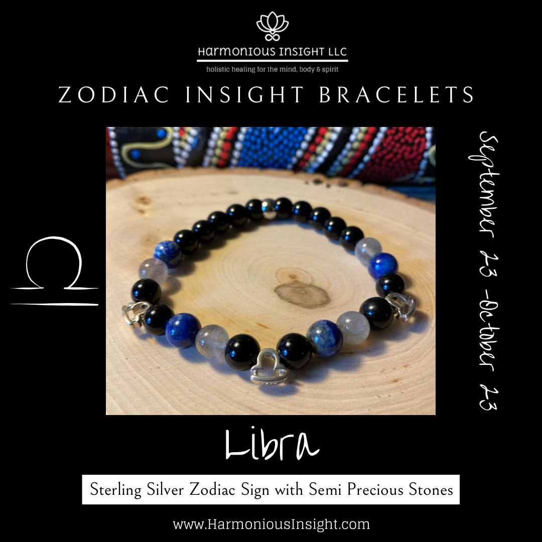 Libra (Balance) is the zodiacal constellation that represents the dates of September 23rd - October 23rd. These dates correlate with the Sun’s passage through this constellation. The astrological element for the Zodiac Sign of Libra is air. This Zodiac Insight Bracelet contains three Sterling Silver Libra Charms with 8 mm Semi-Precious Stones in Labradorite, Lapis Lazuli, and Black Jasper. The bracelet circumference is approximately 8.5 inches. Please contact Harmonious Insight directly if you need an adjustment in size.