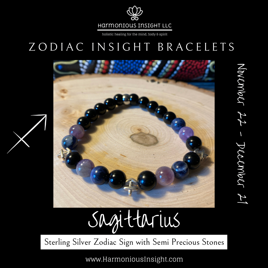 Sagittarius (Archer) is the zodiacal constellation that represents the dates of November 22nd - December 21st. These dates correlate with the Sun’s passage through this constellation. The astrological element for the Zodiac Sign of Sagittarius is fire. This Zodiac Insight Bracelet contains three Sterling Silver Sagittarius Charms with 8 mm Semi-Precious Stones in Sodalite, Amethyst, and Black Jasper. The bracelet circumference is approximately 8.5 inches. Please contact Harmonious Insight directly if you need an adjustment in size.